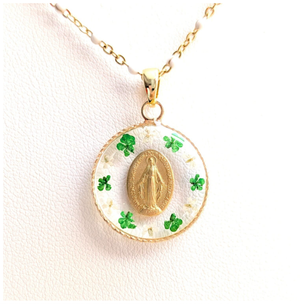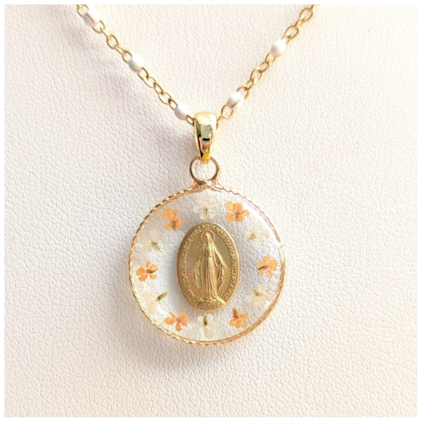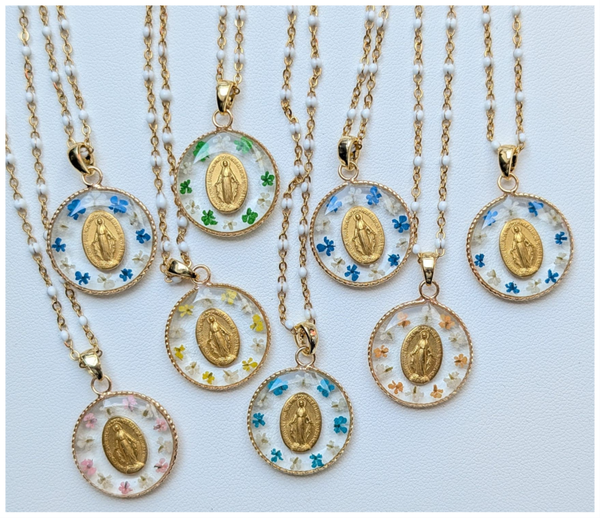 Chaque artiste a un modèle qui lui tient particulièrement à cœur : pour moi, ce sont ces médailles miraculeuses de la Sainte Vierge. Je les ai voulues uniques : c'est pourquoi, après de nombreuses recherches sur la toile, je me suis assurée que jamais la Médaille Miraculeuse n'avait été ainsi valorisée : la Vierge Marie entourée de 12 fleurs, comme les 12 étoiles, les 12 tribus d'Israël, les 12 apôtres... ou de 7 fleurs alternées de perles blanches : 7 dons du Saint-Esprit, les 7 vertus...
