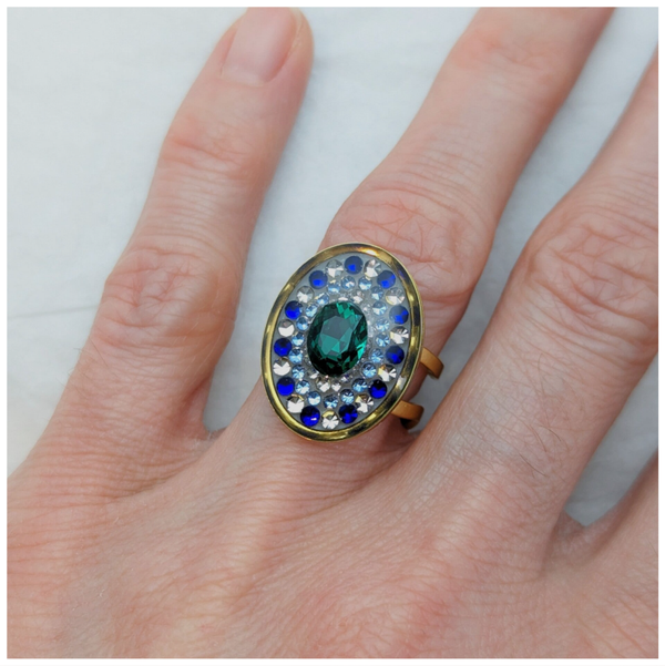 Monté sur une bague ovale en acier inoxydable doré. Double anneau réglable.