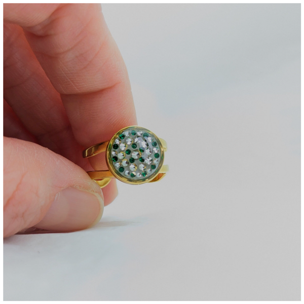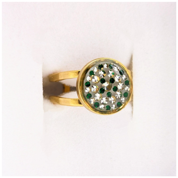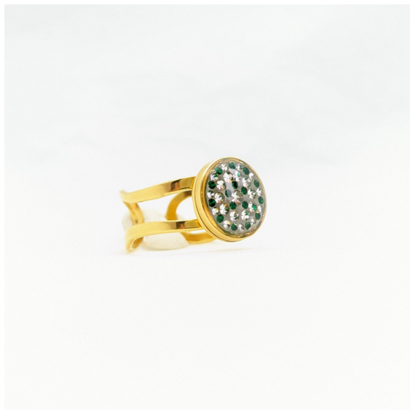 Bague ronde ajustable en acier inoxydable doré "Ronde d'émeraude et de diamants".