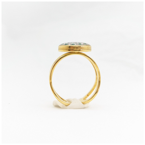 Monté sur une bague ronde en acier inoxydable doré. Double anneau réglable.