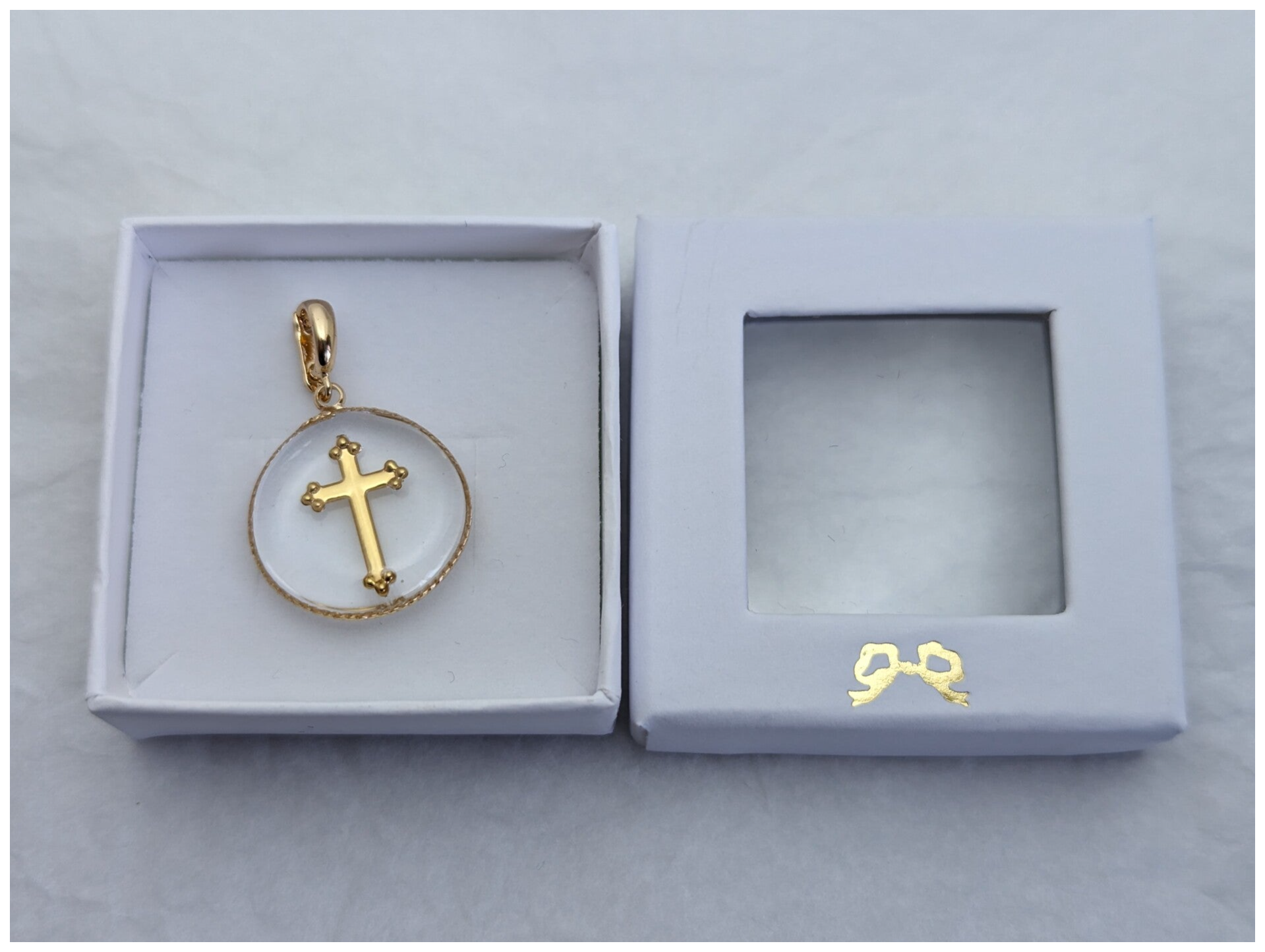 Croix dorée simple (médaillon torsadé en Plaqué or 24K de 20mm), incrustée de micro perles blanches au verso.