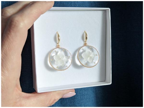 Un bijou d'oreille tout en rondeur, orné d'une délicate fleur d'hortensia légèrement rehaussée en son centre.