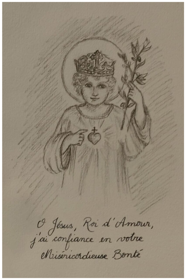 Dessin réalisé par Mère Yvonne-Aimée (1901-1951), religieuse augustine de Malestroit, avec l'invocation au dos :