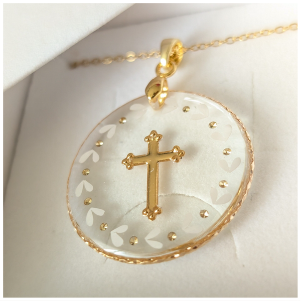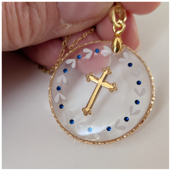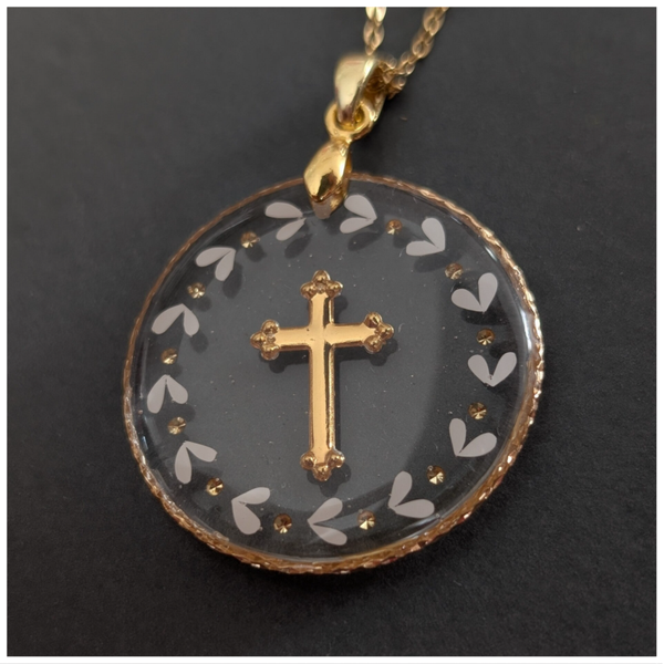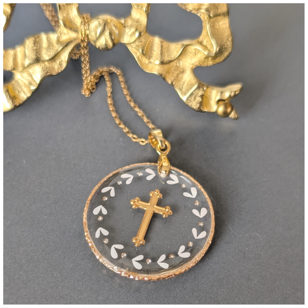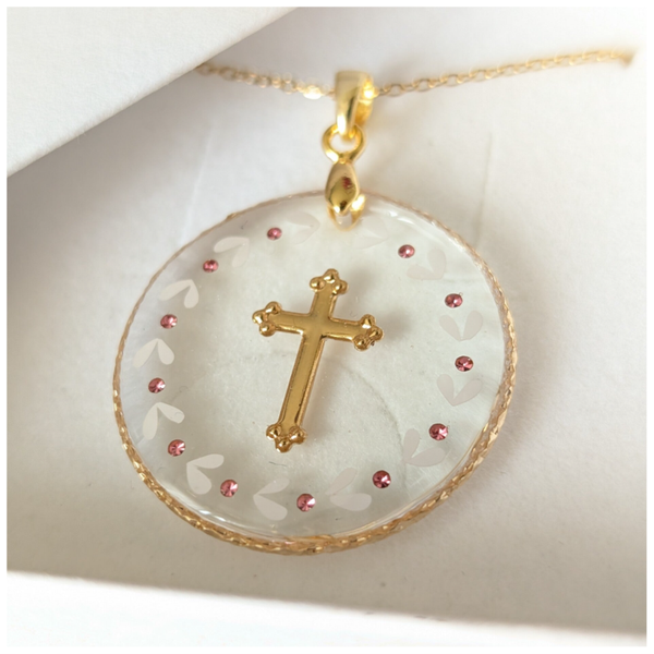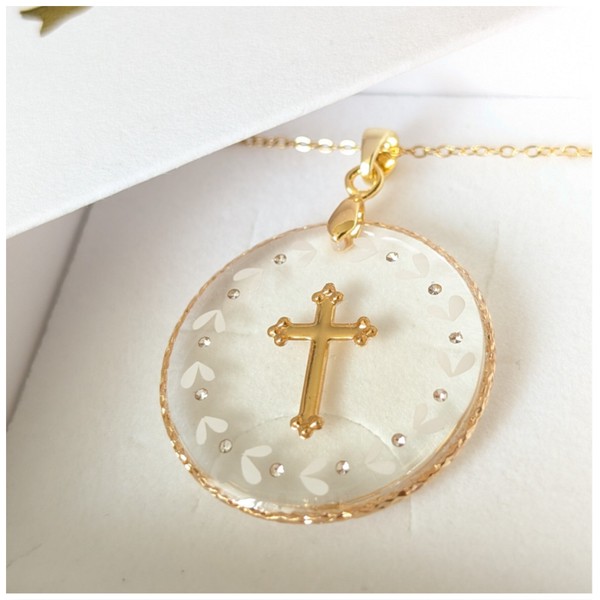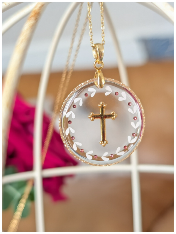 Modèle Croix dorée entourée d'une couronne blanche alternée de micro-strass de la couleur de votre choix.