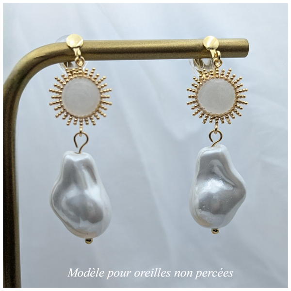 Crochet d'oreille en plaqué or véritable. Fleur de Soleil en laiton couleur or 24K, et résine avec poudre de mica irisée de couleur blanche rehaussé de microstrass. Perle blanche en nacre naturelle.