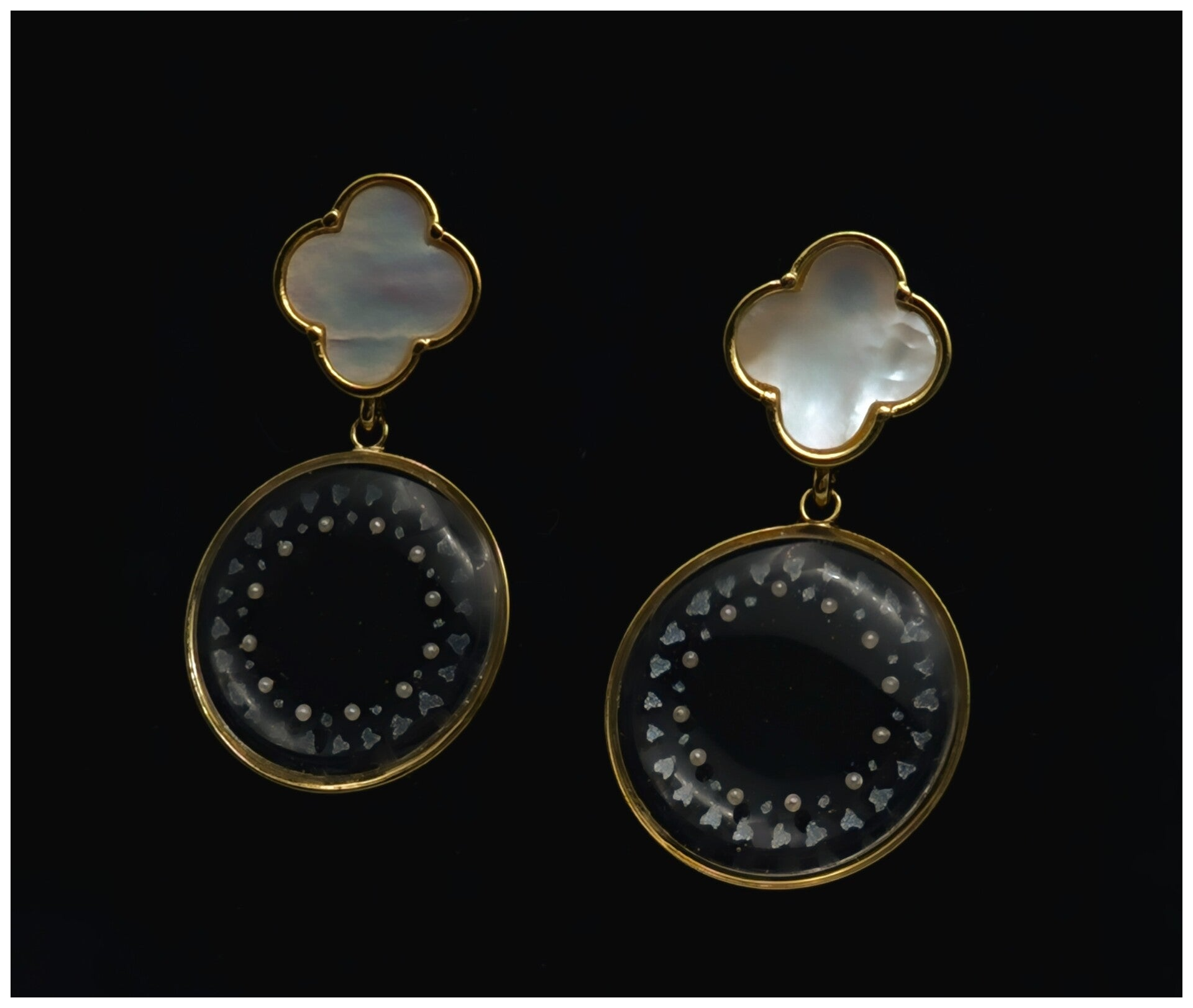 Modèle quadrilobe en nacre blanche naturelle et plaqué-or 18k surmontant un cercle délicatement orné d'un contour rosace en poudre de Mika irisé blanc et de microperles blanches, rappelant la rosace de Notre-Dame de Paris (dans la même veine que mon médaillon Notre-Dame et ma médaille "Rose Mystique").