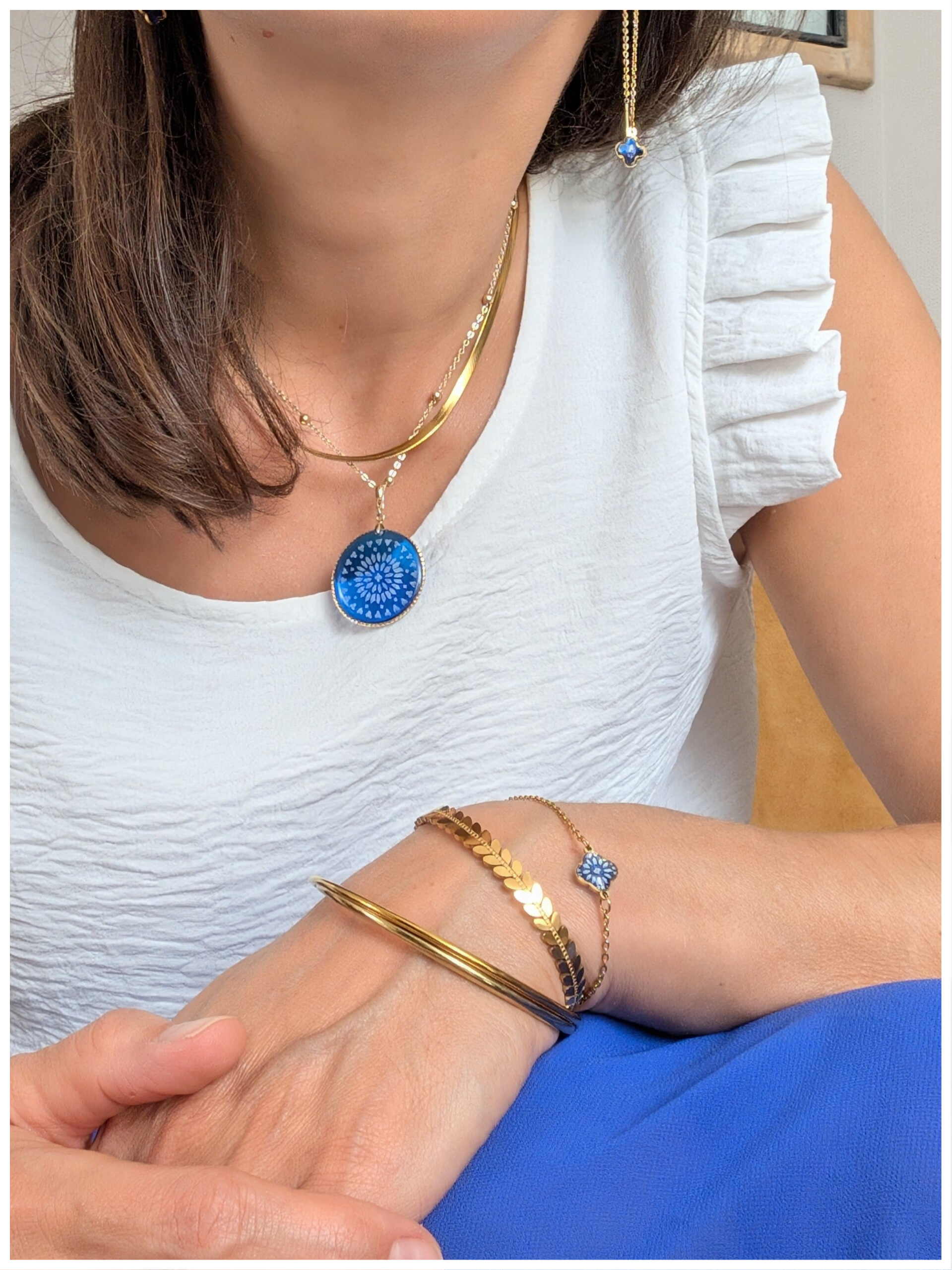 🔹Bracelet "MaDame & M" - Rosace blanche, fond bleu (doré)