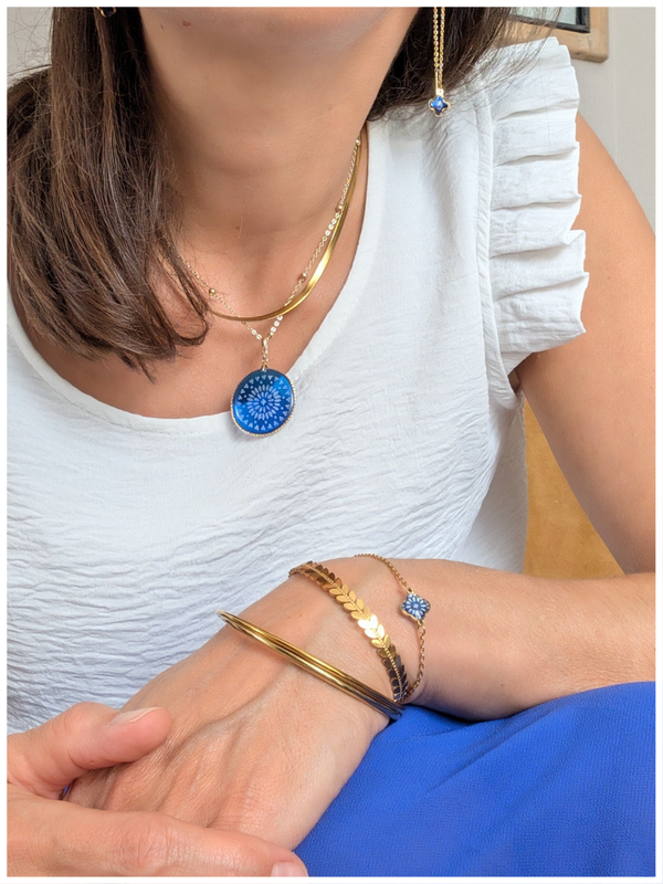 Joli bracelet en acier inoxydable doré, avec un quadrilobe de 10mm, dont le délicat dessin en poudre de mika blanc sur fond bleu rappelle le dessin de la rosace de Notre-Dame.