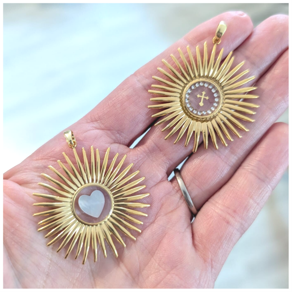 Ce médaillon rayonne comme un soleil miniature, ses pointes d'or capturant la lumière avec une douce intensité.