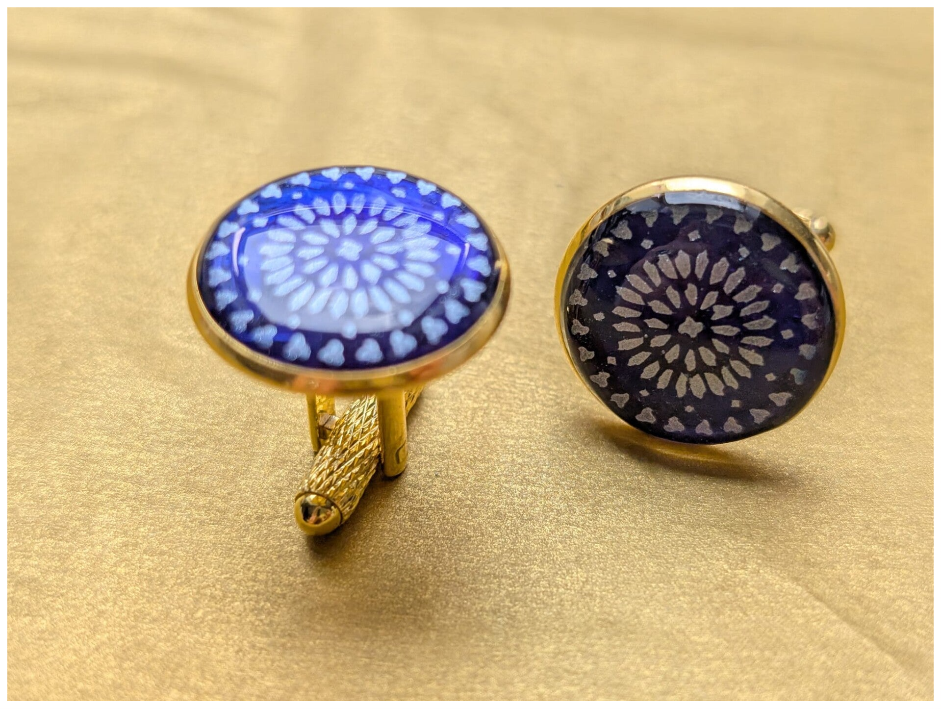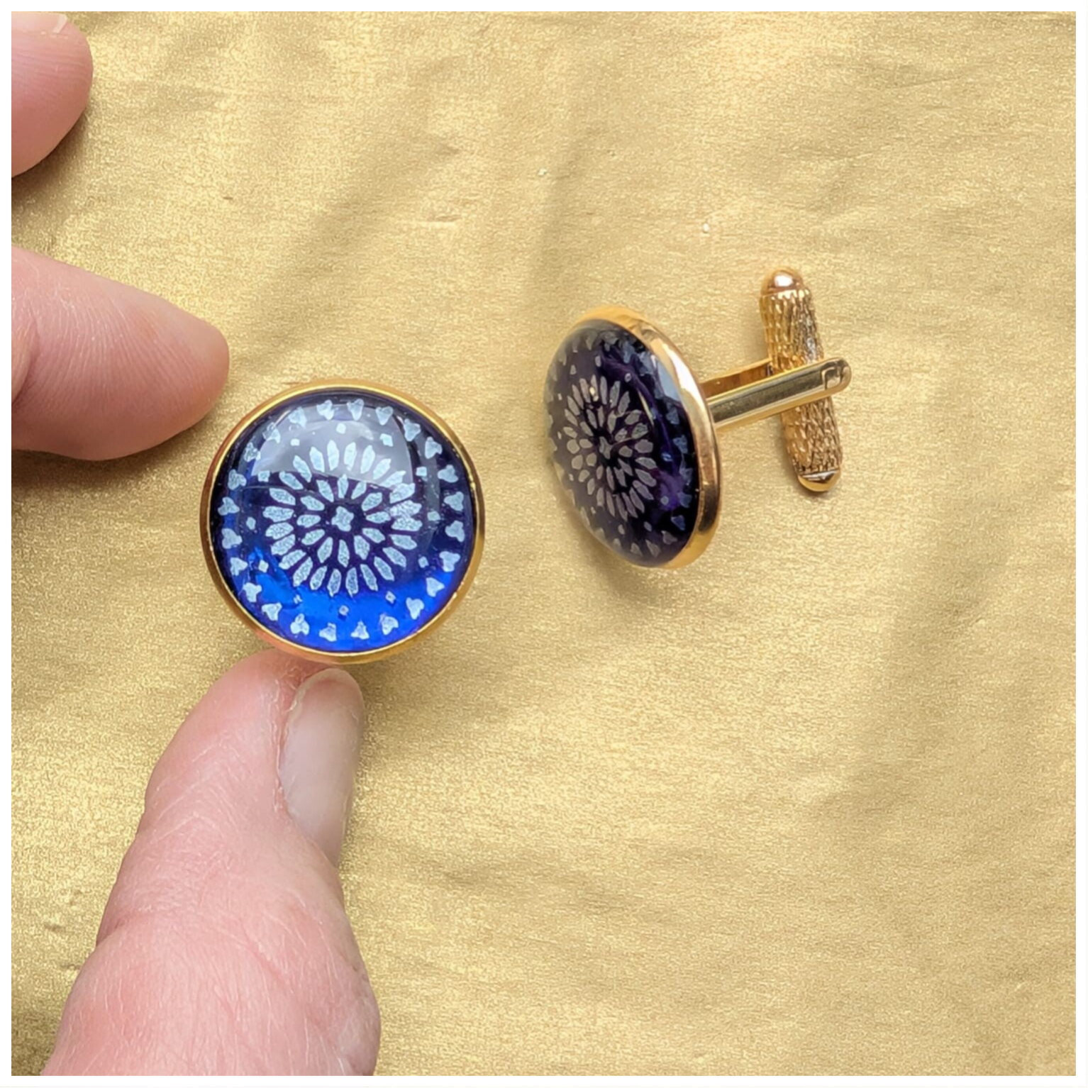 Boutons de manchette "Mr & MaDame", modèle Bleu et Or, composé d'une Rosace poudre de mika irisé blanc sur fond bleu.