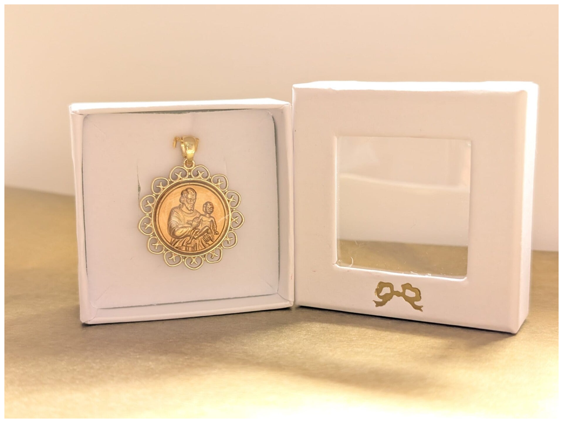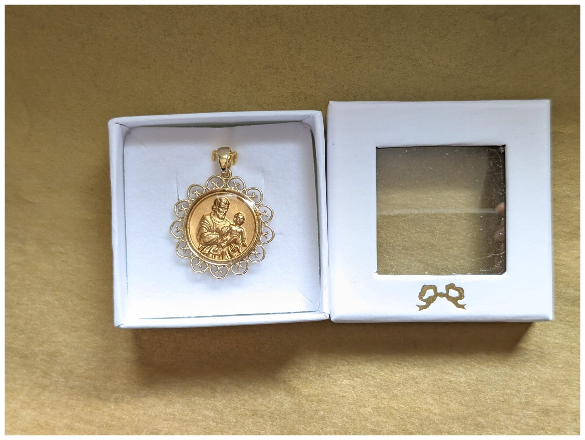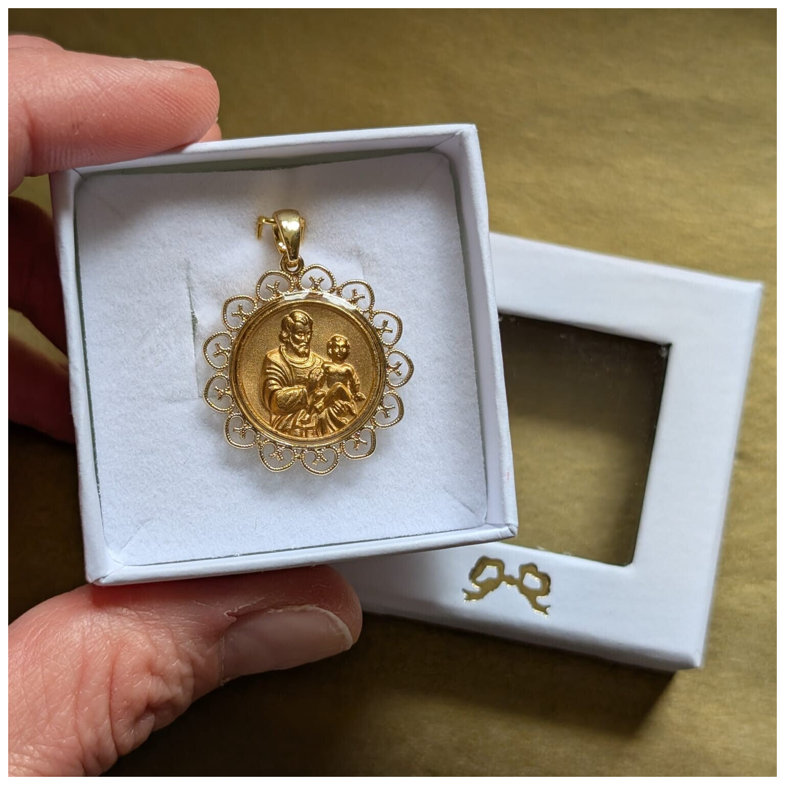 Une pièce unique : Médaille de Saint Joseph de Cotignac mis en beauté dans un délicat cadre dentelé en laiton doré 14k.