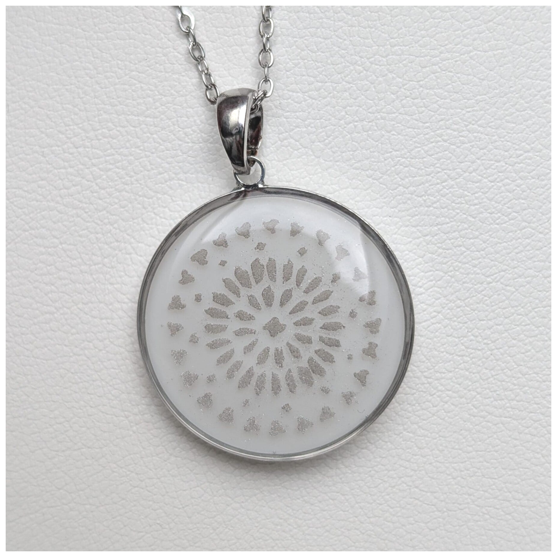 Rosace en poudre de mika blanche sur fond bleu ou poudre de mika argent sur fond blanc.