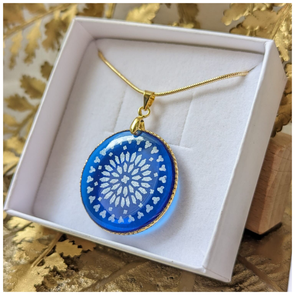 Rosace en poudre de mika blanche sur fond bleu vitrail.