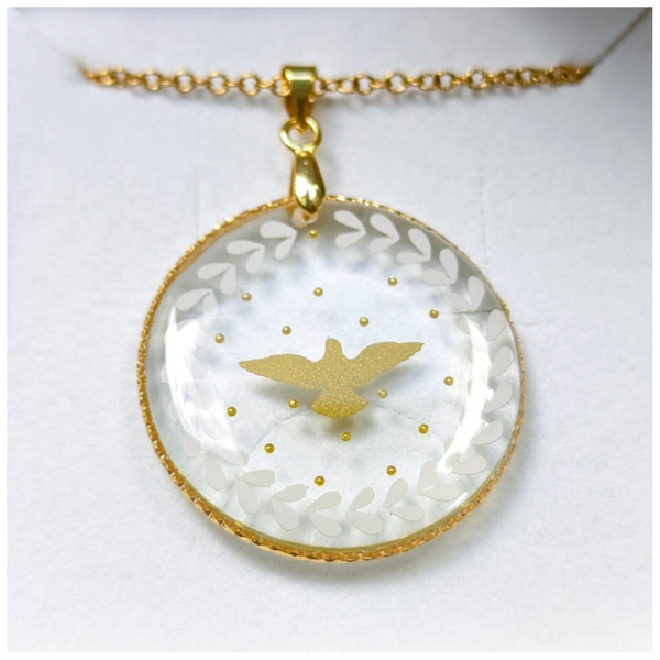 Modèle Colombe dorée et semis de micro perles, le tout entouré d'une couronne blanche.