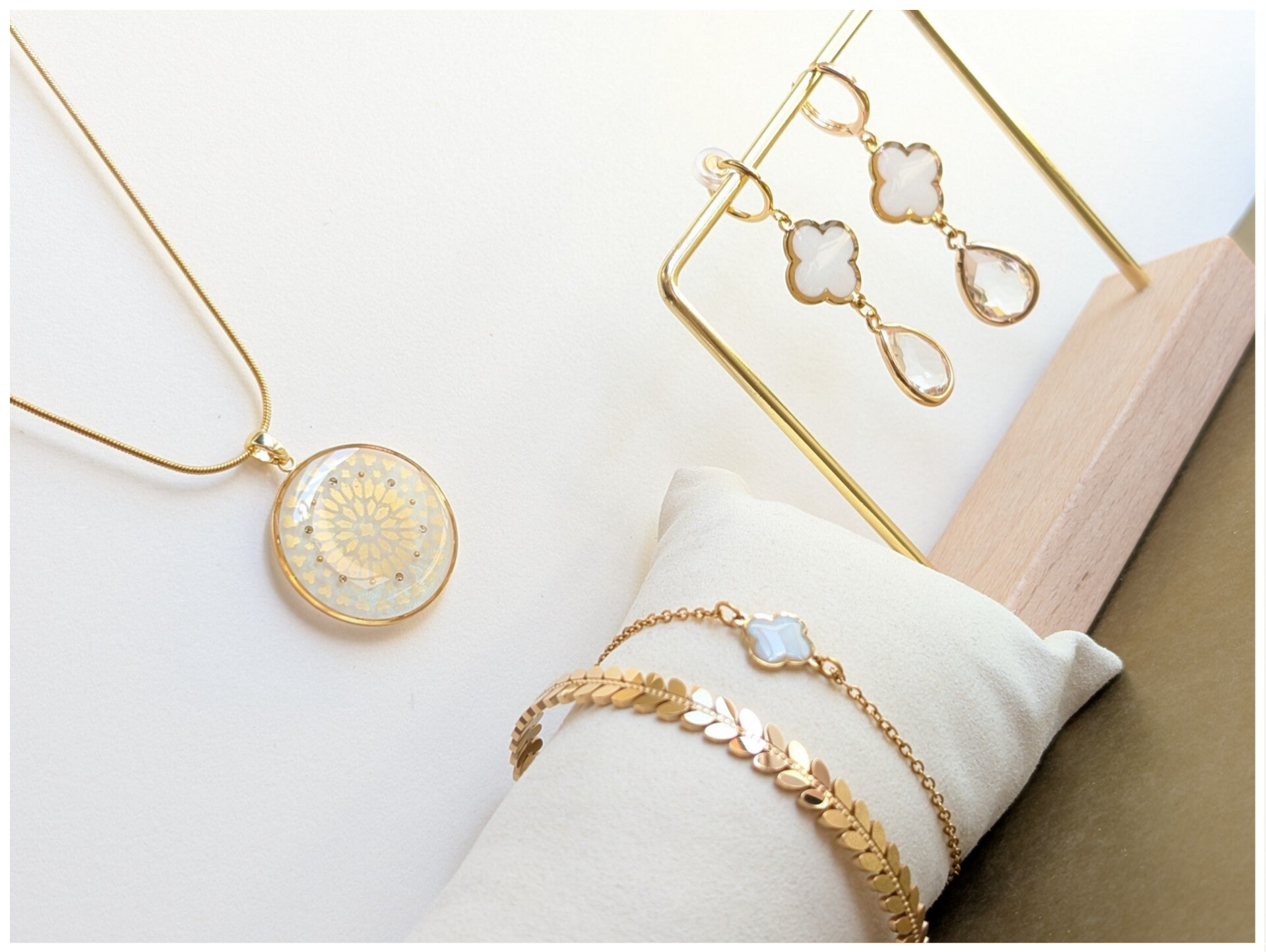 Les supports sont en acier inoxydable ou plaqué-or (sauf mention contraire), avec un remplissage en résine et de véritables fleurs.