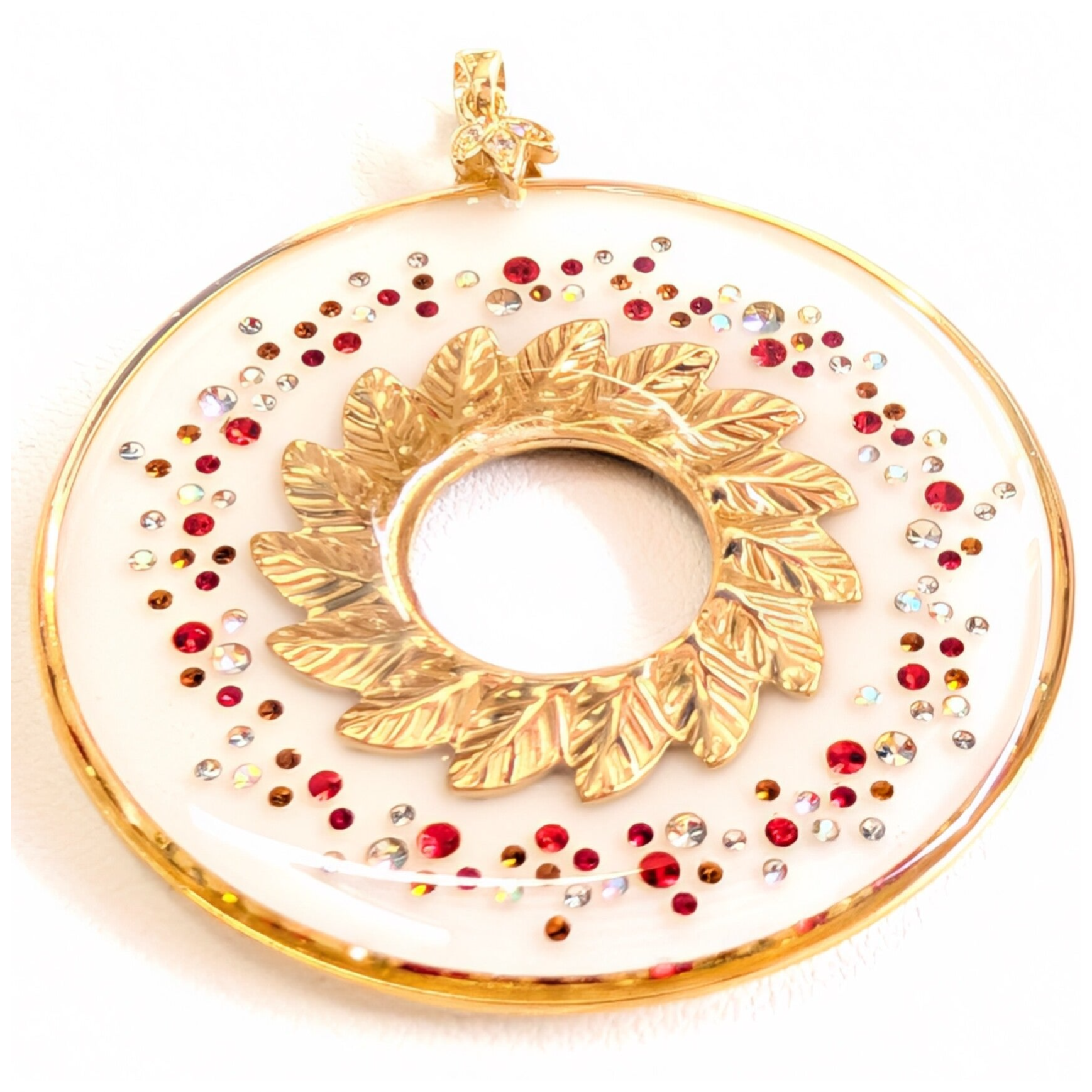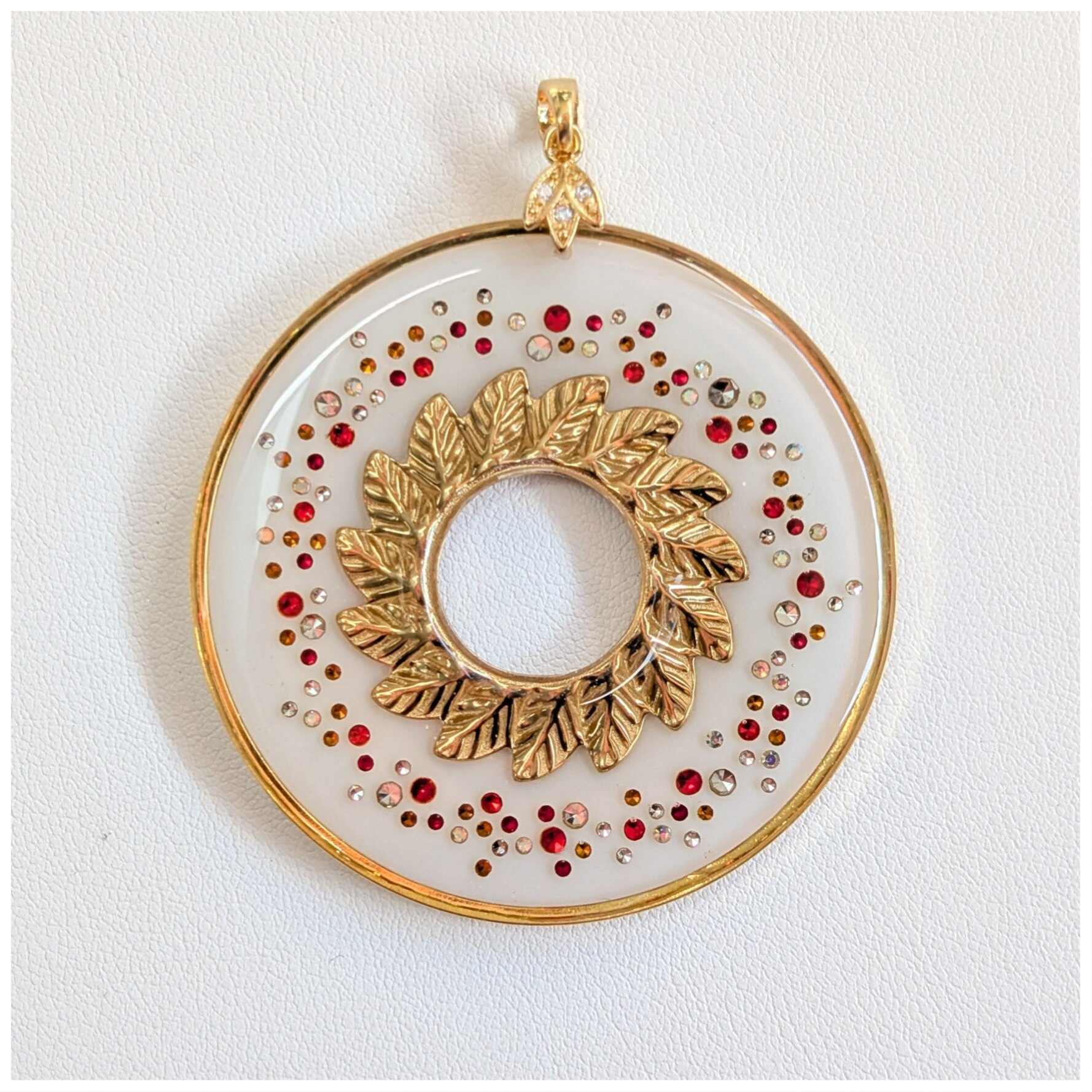 Inclusion à la main d'environ 122 microstrass de tailles et couleurs variées. En son centre, une couronne de feuilles en acier inoxydable doré.