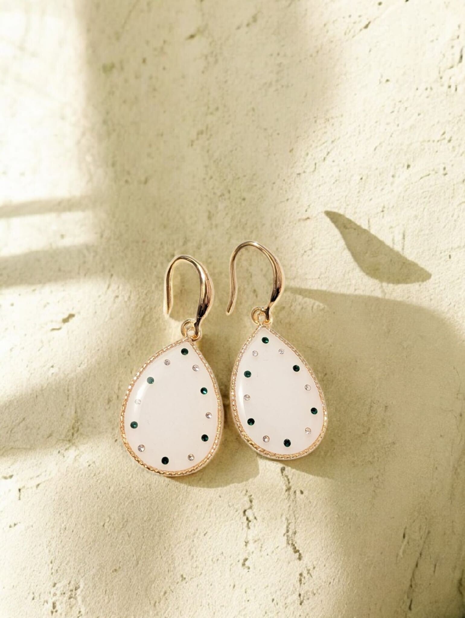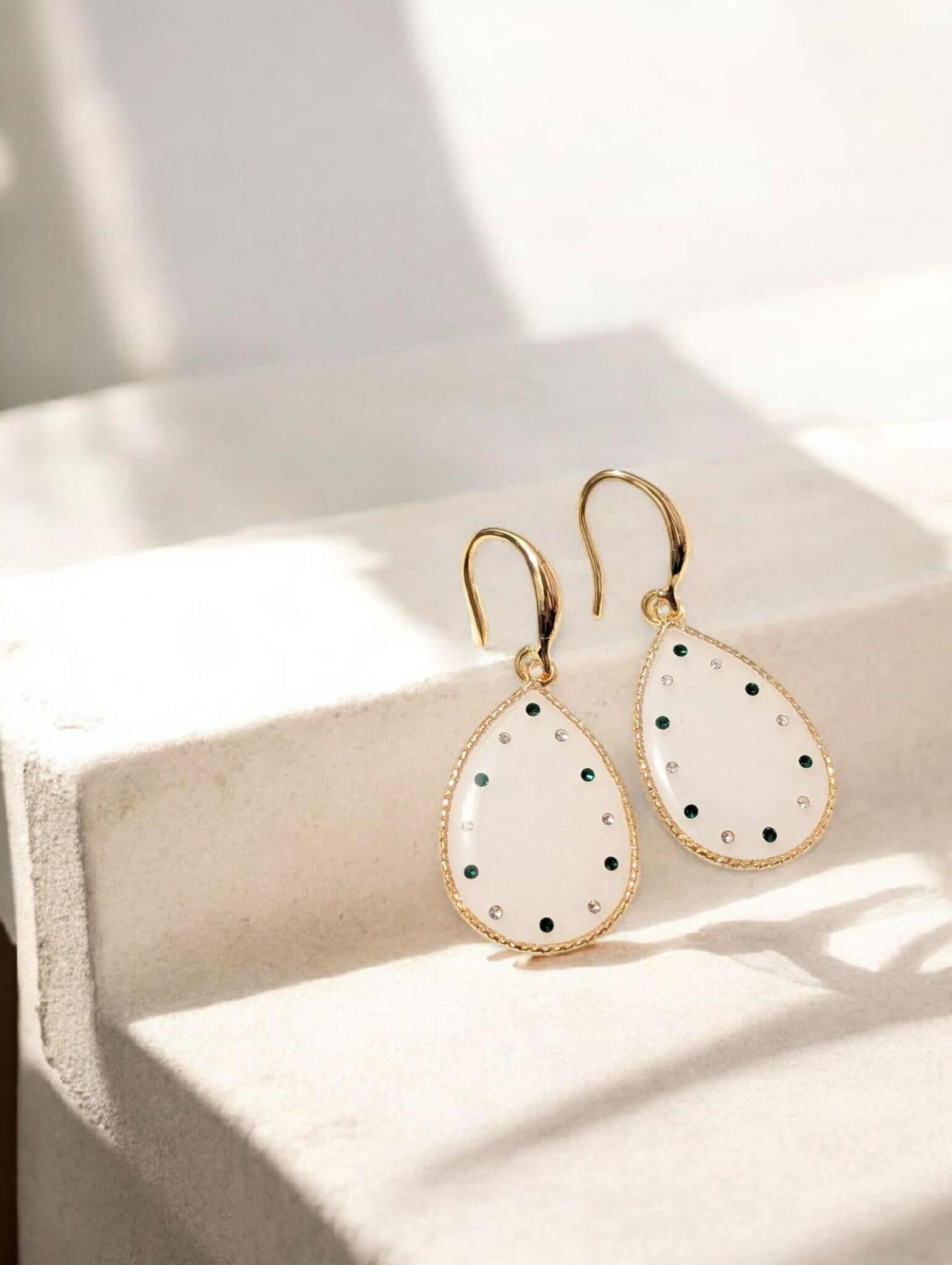Boucles d'oreilles "Perles d'eau" Strass cristal et émeraudes sur fond blanc opalescent.