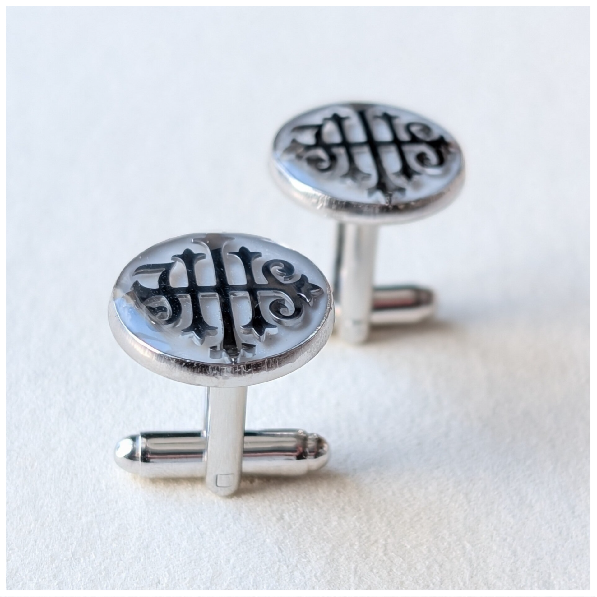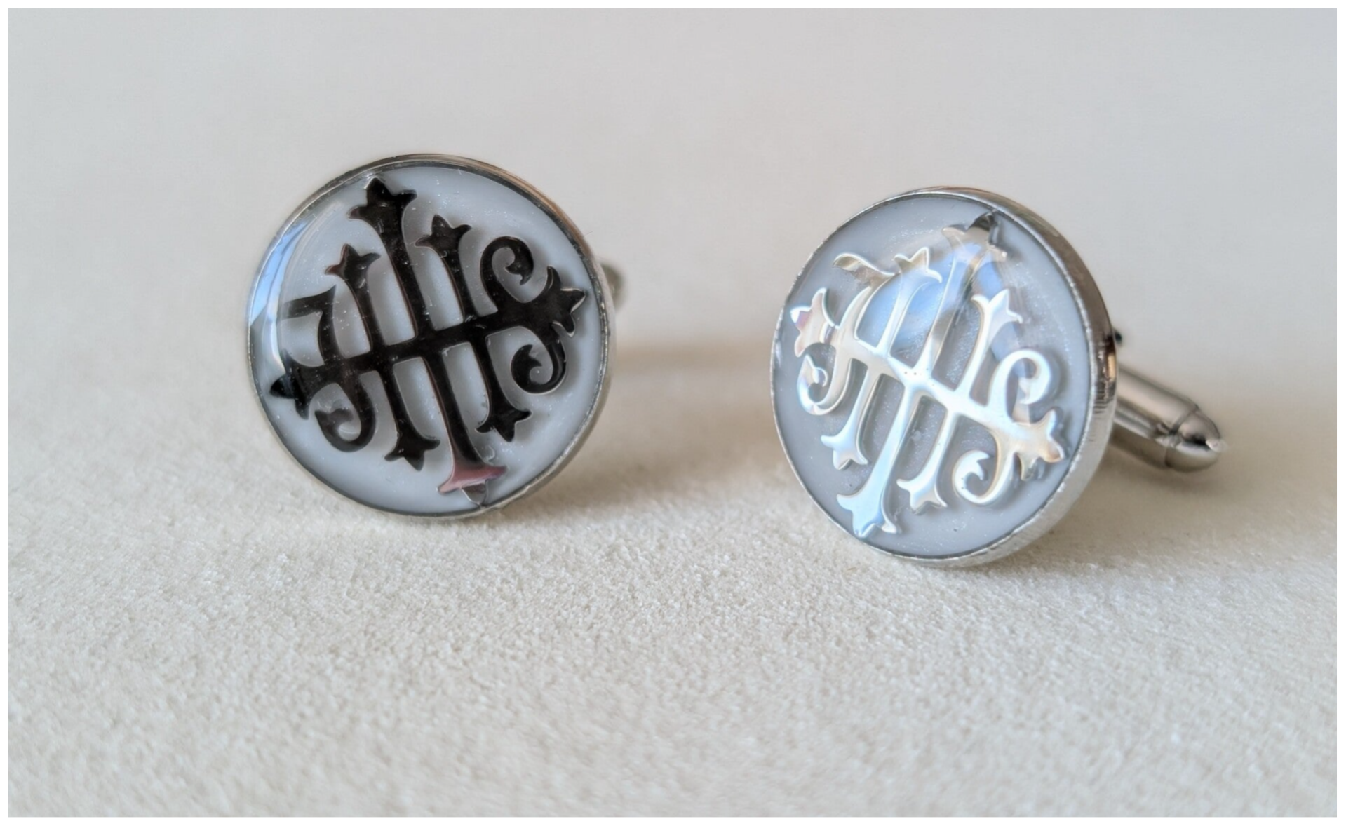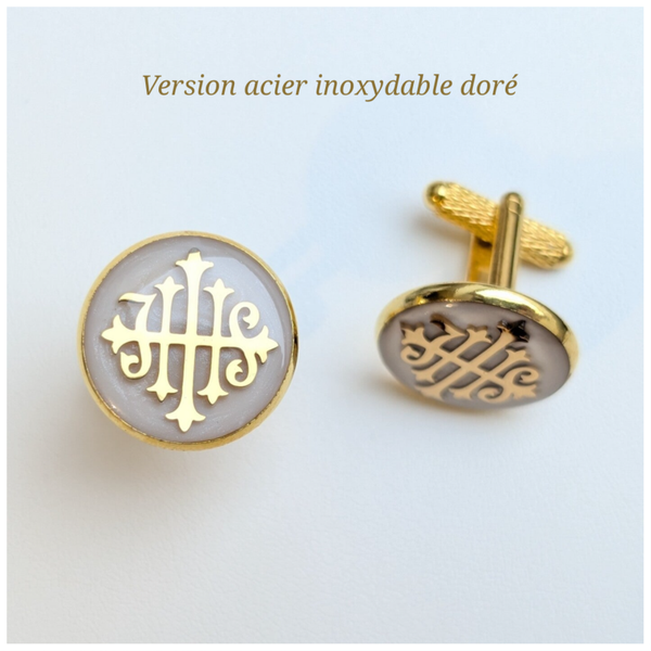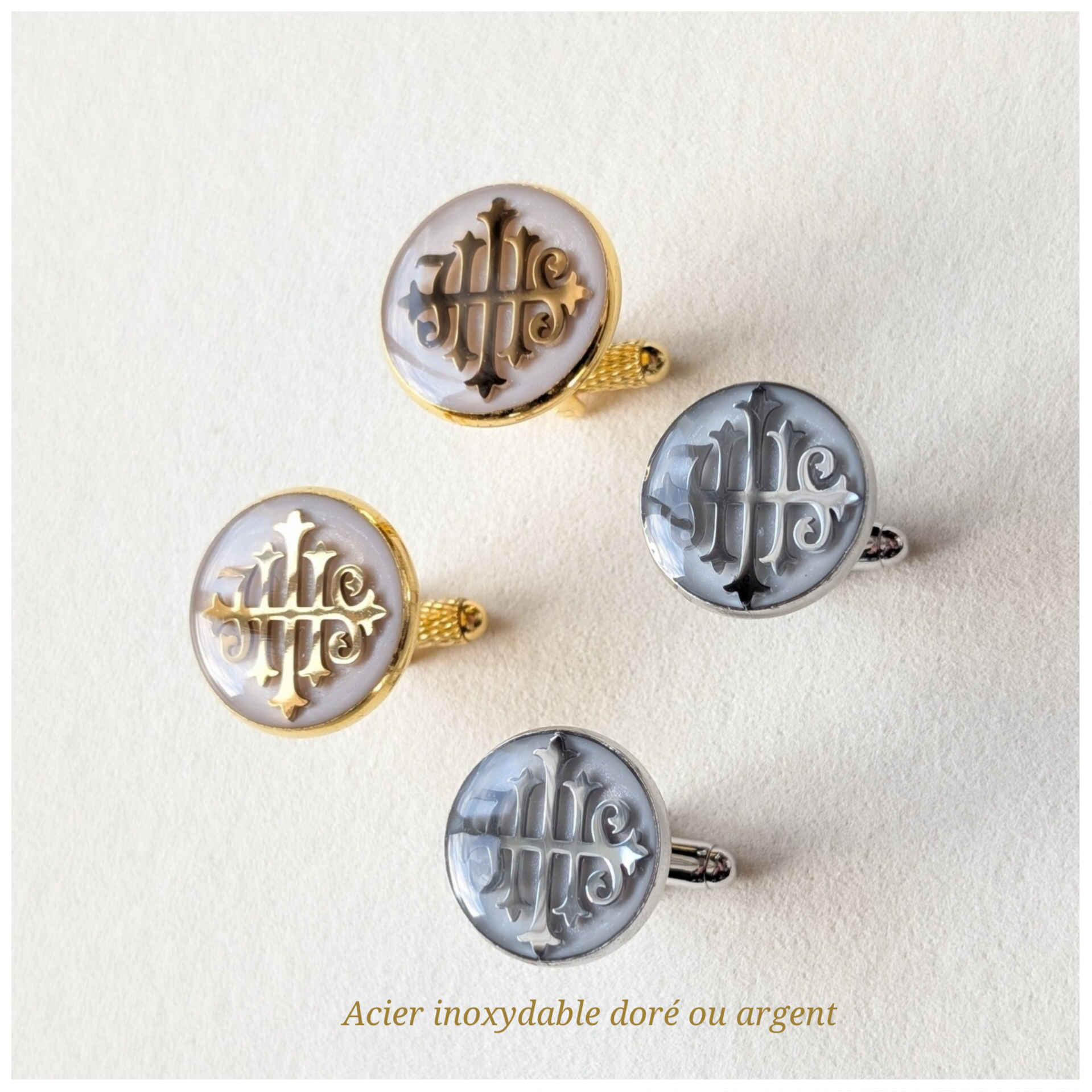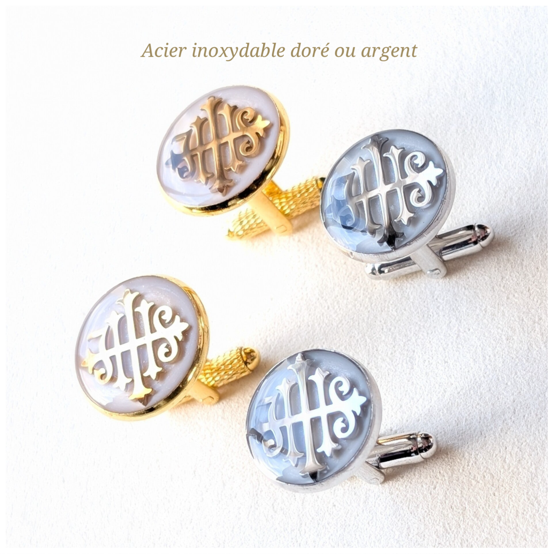 Ces boutons de manchette portent le monogramme JHS – Iesus Hominum Salvator, Jésus, Sauveur des hommes.