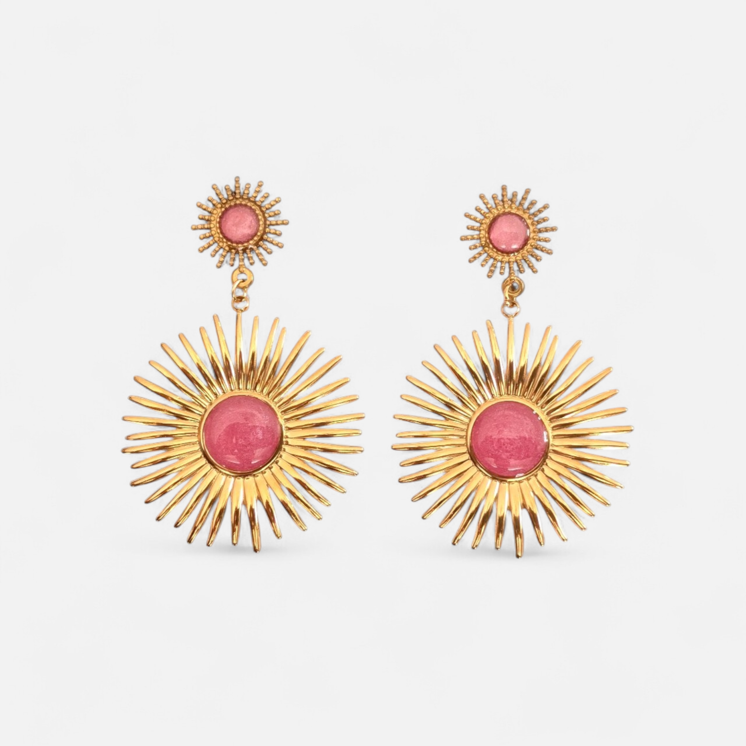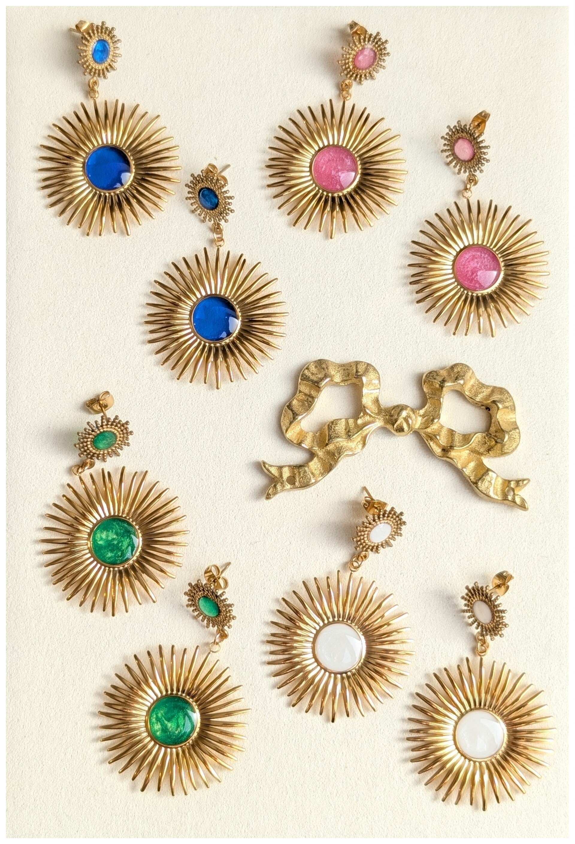 Au centre de chaque soleil, un cabochon de résine colorée capte la lumière et révèle des teintes profondes : bleu royal, rose emblématique, vert précieux ou blanc lumineux.