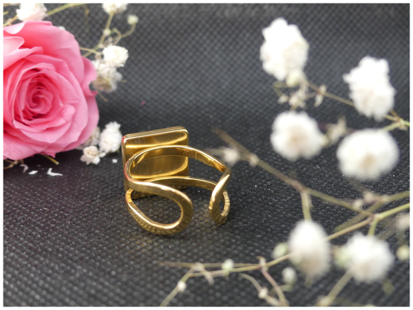 Bague carrée réglable, entièrement réalisée sur une monture en acier inoxydable dorée. Des strass et des perles, des petites fleurs rouges pour symboliser l'aristocratie...