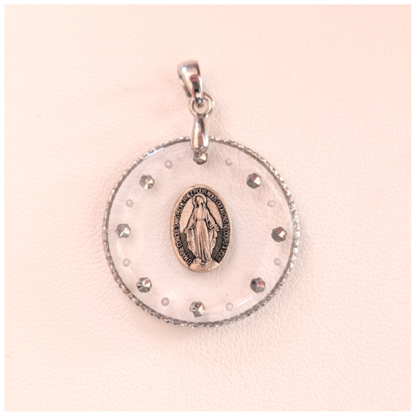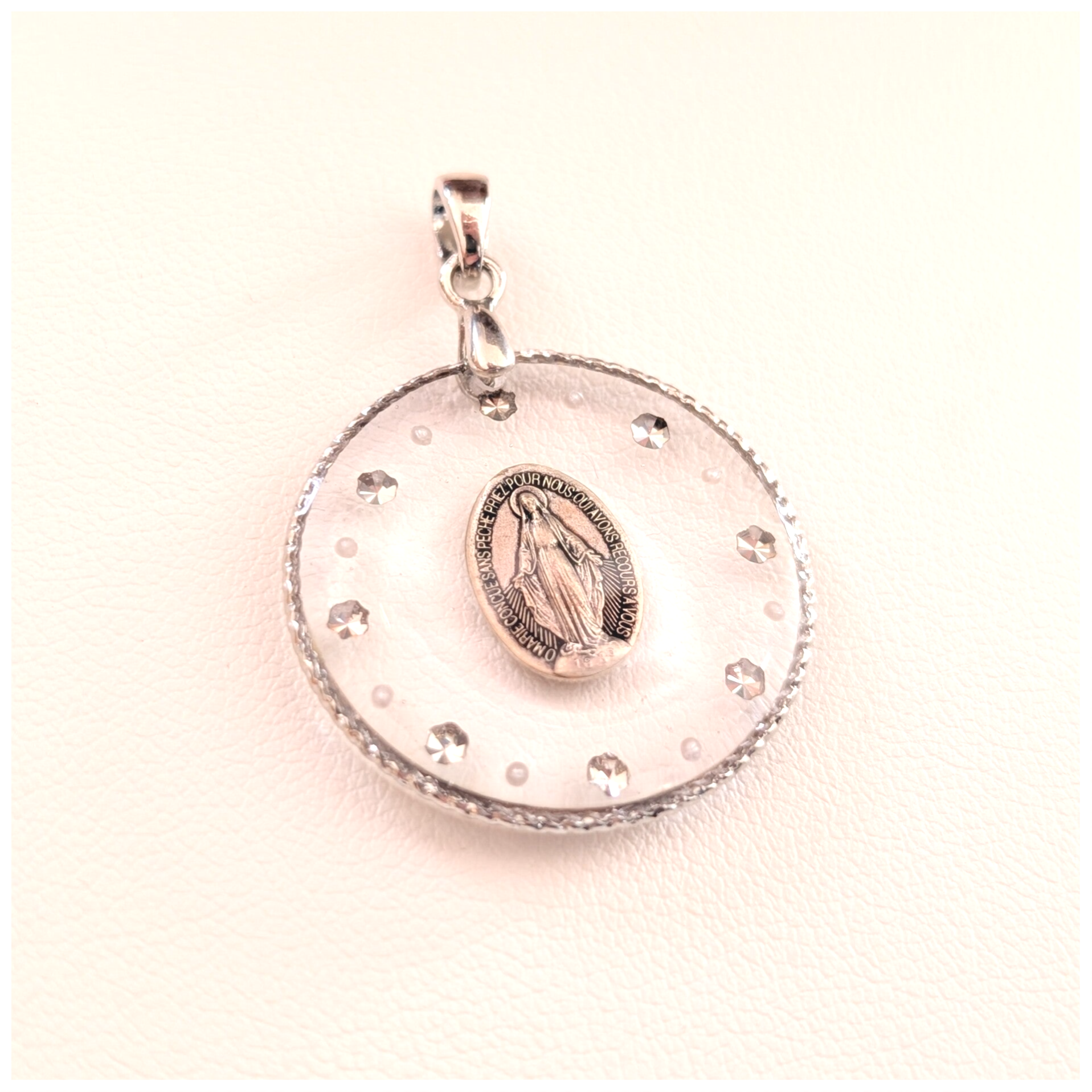Médaille de la Vierge entourée de cristaux et perles ou seulement de cristaux (blancs, bleus...)